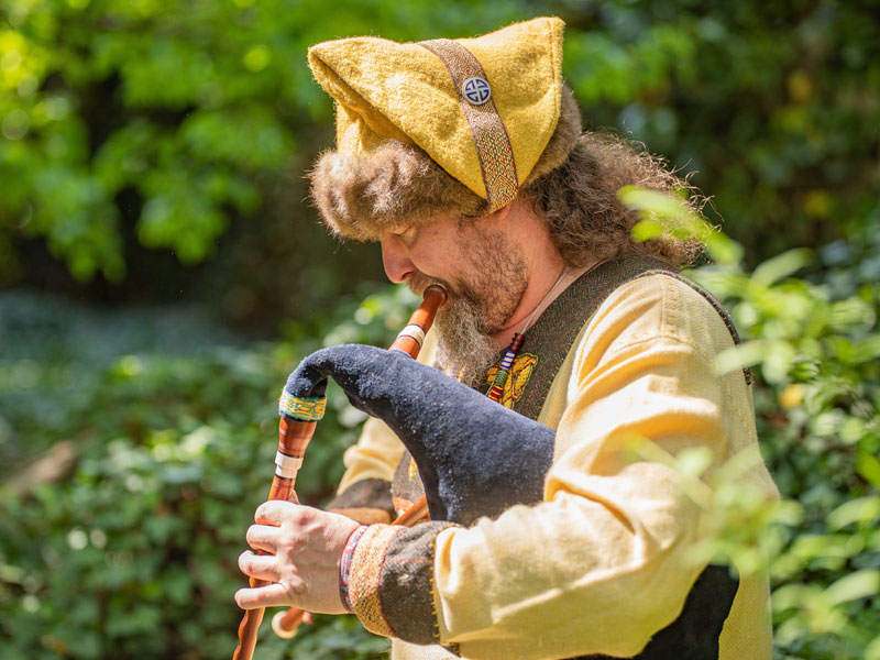 Kalt und eisig ist der hohe Norden. Die Lieder aus dem Land des Eises sind es aber ganz und gar nicht. Es erklingen Melodien aus Schweden, Norwegen und Finnland gespielt auf Säckpipa und Nyckelharpa. Dazu gibt es Geschichten von Thor, Loki, dem Allvater Odin und den Geschwistern Tjelfe und Roskwa. Die Gewandung entspricht der späten Wikingerzeit.